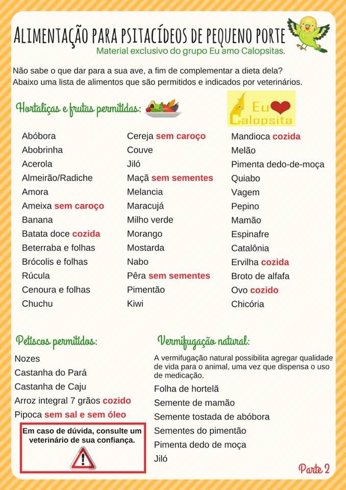 Além da ração extrusada, que deverá ser a principal, pode ser oferecido a ave mix de sementes, farinhada, duas vezes na semana ovo cozido e vegetais.